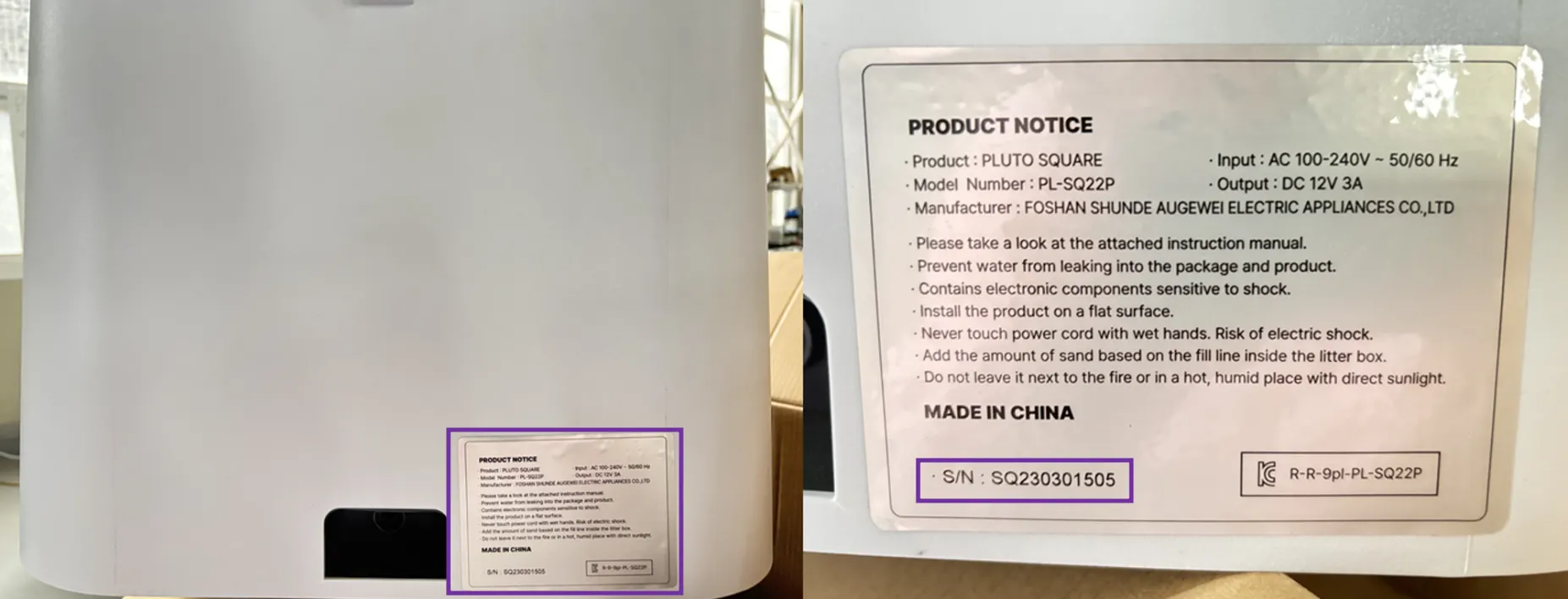 좌측 하단에 표기된 ‘S/N’ 뒤 숫자의 앞 6자리가 SQ2303 (23년 3월) 이전인 경우, 두부모래 모드 적용 모델입니다.